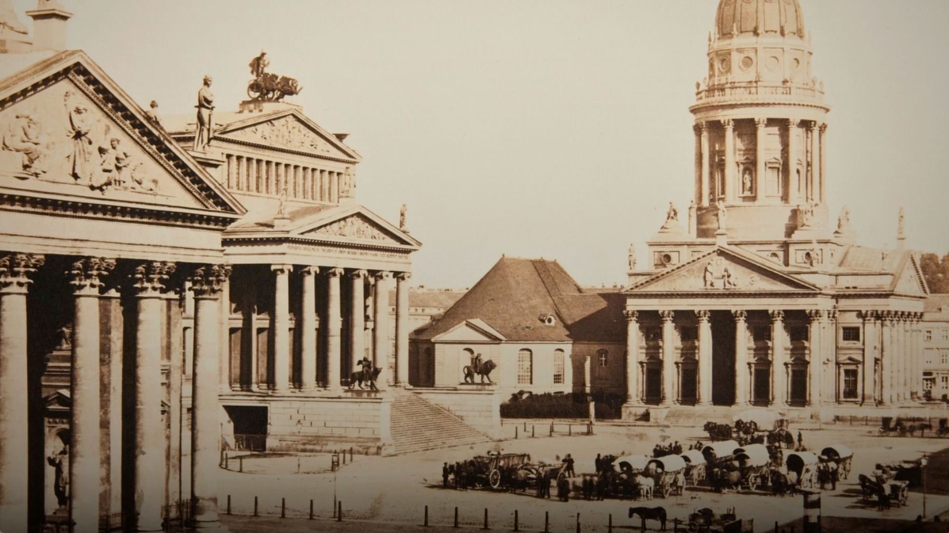 Der Berliner Gendarmenmarkt mit dem Königlichen Schauspielhaus (Mitte), um 1856/58 (© Stadtmuseum München)