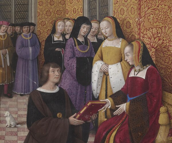 Hofdichter und -sekretär Jean Marot überreicht Anne de Bretagne sein Buch Le Voyage de Gênes über den französischen Feldzug gegen Genua 1507, Miniatur von Jean Bourdichon (1510–20)