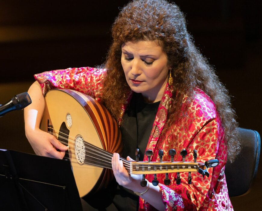 Waed Bouhassoun was born near the city of Suwayda in the south of Syria and grew up in a music-loving family. She has been playing the oud since the age of seven. As a child, she lived in Yemen with her parents for two years, discovering the local music at an early age. She received her professional education at the Damascus Conservatory, which at the time was strongly influenced by Western classical music. Her highly personal musical style draws on all these diverse influences. She quickly made a name for herself with her first public appearances in Aleppo and soon received invitations to the Maison des Cultures du Monde and the Institut du Monde Arabe in Paris. Since then, she has performed throughout Europe, in South Korea, Canada, and Columbia. Her award-winning debut album La Voix de l’amour was released in 2009, followed by L’Âme du luth in 2014 and La Voix de la passion in 2016. In addition to her solo career, she regularly appears with Jordi Savall and his ensemble Hespèrion XXI and as artistic director of the Orpheus 21 project. She has also given workshops for refugees and displaced children cut off from their cultural roots. Waed Bouhassoun has been a regular guest at the Pierre Boulez Saal since her debut as part of the 2019 Arabic Music Days. In 2018, she was made a Chevalier de l’Ordre des Arts et des Lettres by the French government. She resides in Paris and received her Ph.D. in ethnomusicology in 2020 with a thesis on funeral songs of the Druzes of southern Syria.